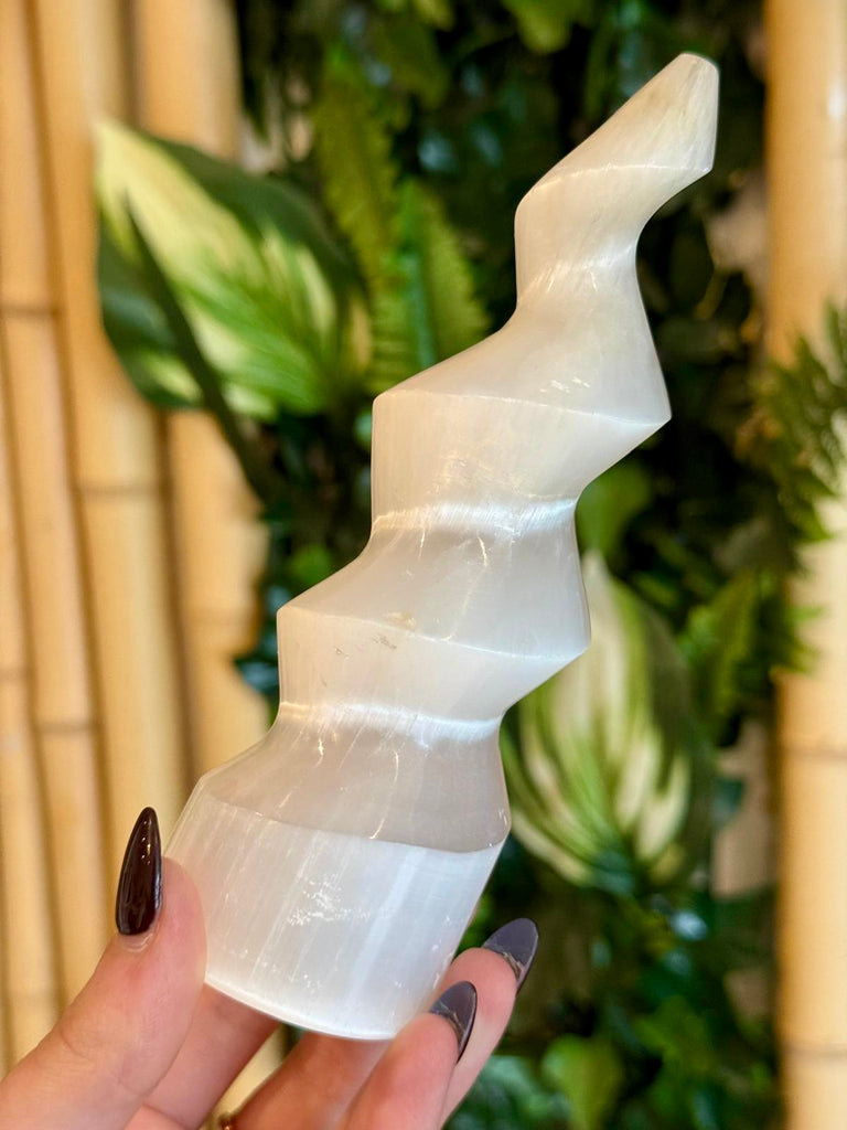 A selenite twist is a polished crystal tool carved from natural selenite into a spiralled, twisted shape. The twisting design is believed to help direct and amplify energy flow, making it popular for energy cleansing, meditation and spiritual practices. Selenite itself is known for its translucent, pearly white appearance and is associated with clarity, purification and calming energy. The wand shape makes it easy to hold or use for clearing spaces, charging other crystals or balancing the body’s energy field.