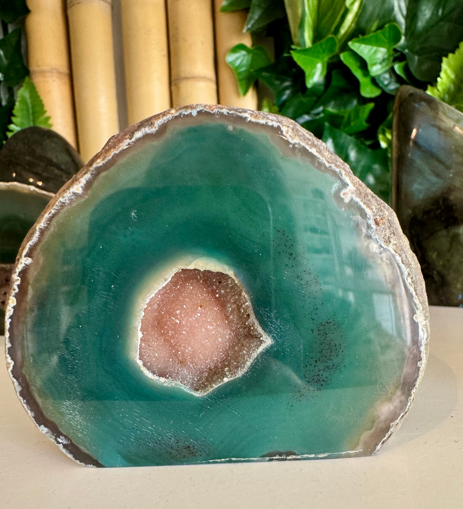 Agate Geode is a soothing gemstone that supports mental clarity, focus, and analytical thinking. It promotes inner calm, reduces stress, and fosters emotional balance. By providing a sense of security, it aids in stable relationships and personal resilience.