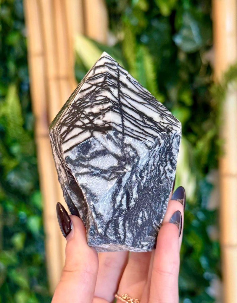 A Jasper Picaso, Semi-Polished, point is a naturally patterned jasper stone shaped into a pointed form with partially polished surface, showcasing its earthy tones of grey, black, cream and rust in abstract, Picasso-like patterns. It is believed to promote grounding, creativity and emotional stability, making it both a striking decorative piece and a tool for meditation or energy work.